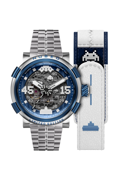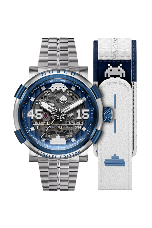 A bold tribute to one of the most iconic video games in history, this striking timepiece features a 3D multi-layered skeletonized dial enhanced by luminous, pixel-inspired details that capture the spirit of classic gameplay. Turn it over to reveal the exhibition caseback, where a custom luminous rotor pays homage to the relentless waves of alien invaders that shaped a generation of gaming.