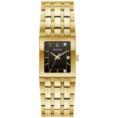 Bulova Women's Quadra 21mm Quartz Watch 97P167. The case is built with high-quality Gold Tone Stainless Steel and can withsand up to 30 m (100 feet) of water resistance. The dial is Black and protected by a Mineral Crystal. The Bracelet is Gold Stainless Steel. The movement is Quartz. (97P167)