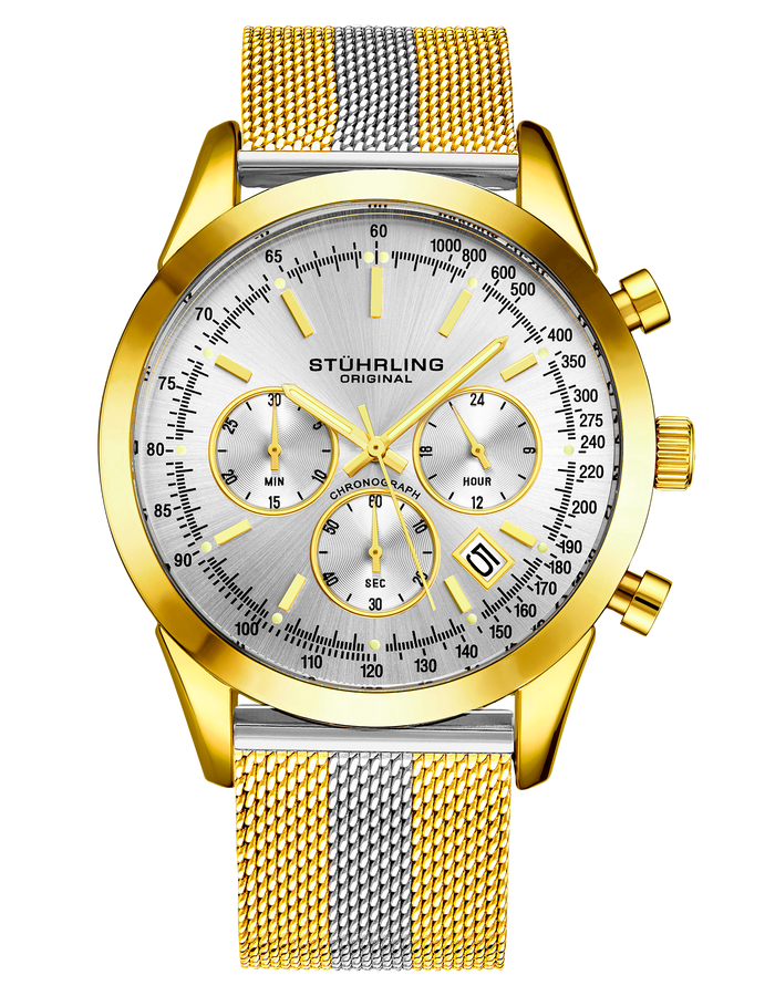 Men's Quartz Chronograph Date Watch, Gold Tone Alloy Case, Silver Dial, Gold and Silver Tone Stainless Steel Mesh Bracelet