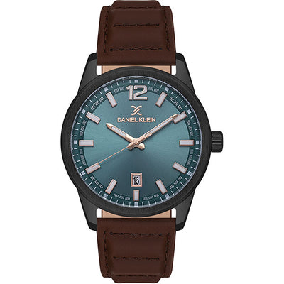 Daniel Klein 42mm mens analog watch with a 22mm padded vintage style leather strap, date calendar, 5 ATM W/R - Brown / Green Dial - DK13667-5