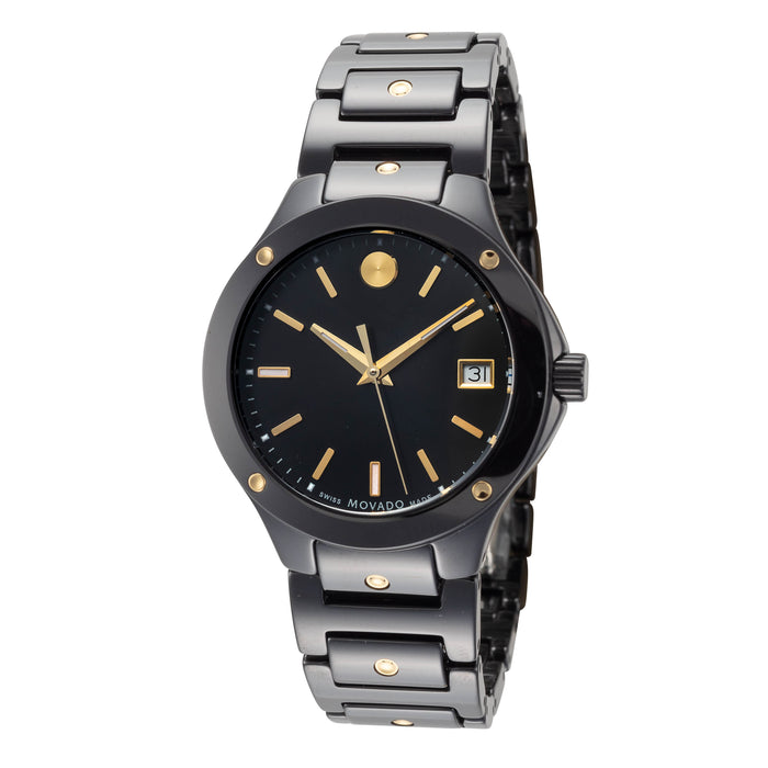 Movado Women's SE Quartz Watch. The case is built with high-quality Ceramic and can withstand up to 30 m (100 feet) of water resistance. The dial is Black and protected by a Sapphire Crystal Scratch Resistant. The Bracelet is Black and Yellow Ceramic with a Deployment Clasp. The movement is Swiss-Made Quartz. (0607741)