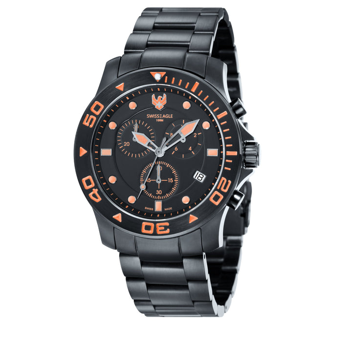 The Swiss Made Chronograph from Swiss Eagle's Sea Bridge collection. Elegant and functional, this watch boasts a Swiss made quartz chronograph with a date window display and three sub dials. The solid marine grade stainless steel and scratch resistant sapphire crystal lens make it a durable choice for any diver.