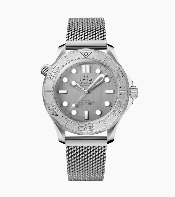 ince 1993, the Seamaster Diver 300M has enjoyed a legendary following. Todays modern collection has embraced that famous ocean heritage and updated it with OMEGAs most advanced innovation and design.This 42 mm model is crafted in stainless steel and includes a grade 5 titanium bezel with a laser-ablated diving scale in positive relief and a single dot of white Super-LumiNova at 12 oclock.PVD stainless steel is used to create the brushed dial as well as the polished and skeletonized hands and indexes, which are filled with white Super-LumiNova. Other markings, including the OMEGA logo, are transferred in black.The watch is presented on a brushed mesh bracelet with clasp, and is driven by the OMEGA Co-Axial Master Chronometer Calibre 8806, which can be seen through the sapphire-crystal caseback.