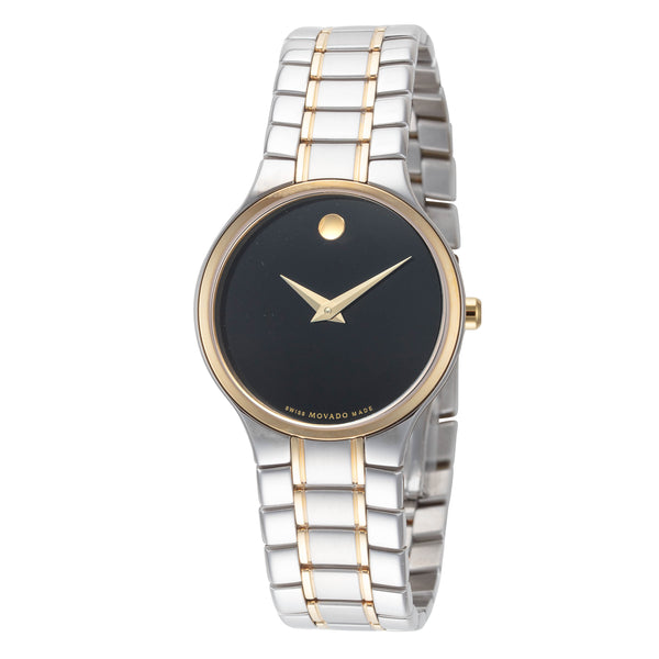 Movado Women's Serio Quartz Watch. The case is built with high-quality Stainless Steel and can withstand up to 30 m (100 feet) of water resistance. The dial is Black and protected by a Sapphire Crystal Scratch Resistant. The Bracelet is Silver and Gold Stainless Steel with a Deployment Clasp. The movement is Swiss-Made Quartz. (0607289)