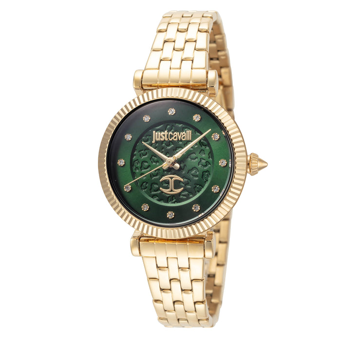 Just Cavalli Women's SET 32mm Watch. The case is built with high-quality Stainless Steel and can with stand up to 30 m (100 feet) of water resistance. The dial is Green and protected by a Mineral Crystal. The Bracelet is Gold Stainless Steel and the movement is Quartz (JC1L266M0035)