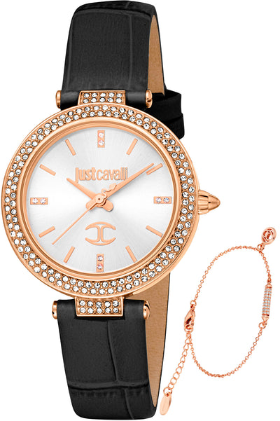 Just Cavalli Women's SET 32mm Watch. The case is built with high-quality Rose Gold Tone Stainless Steel and can with stand up to 50 m (165 feet) of water resistance. The dial is Silver and protected by a Mineral Crystal. The Strap is Black Leather and the movement is Quartz (JC1L274L0035)