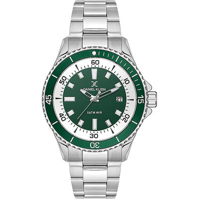 Daniel Klein 43mm round mens analog nautical watch with a 22mm Stainless steel strap, seconds on dial, date calendar, 5 ATM W/R - Silver / Green Dial - DK13684-3. Design inspired by Breitling Superocean 44.