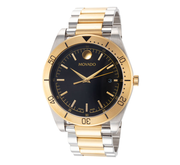 Movado Men's Sport Quartz Watch. The case is built with high-quality Stainless Steel and can withstand up to 30 m (100 feet) of water resistance. The dial is Black and protected by a Sapphire Crystal Scratch Resistant. The Bracelet is Silver and Gold Stainless Steel with a Deployment Clasp. The movement is Swiss-Made Quartz. (0607991)