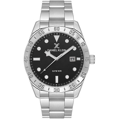 Daniel Klein 43mm mens diver style analog watch with a 22mm stainless steel strap, sunray dial, date calendar, 5 ATM W/R - Silver / Black Dial - DK13654-1. Design Inspired by Rolex Submariner.