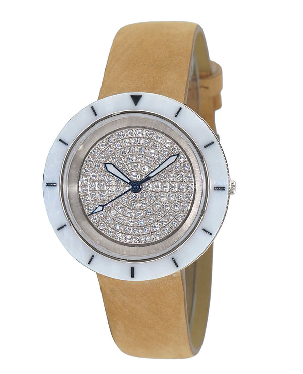 ONISS TOULON LADIES, WHITE HIGH-TECH CERAMIC with 118 PCS SETTING STONES, BROWN GENUINE LEATHER BAND.