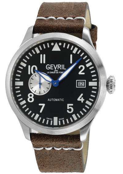Embark upon a journey of opulent distinction with the illustrious Vaughn Collection, a realm of horological splendor where the essence of unadorned elegance requires no preamble. Emanating from the revered ateliers of Gevril, the Vaughn Collection soars beyond the ordinary, transcending the bounds of iconicity through bold contours and unmistakable design. Exuding an aura of audacious grandeur, this collection beckons in an array of captivating colorways, each masterpiece a testament to Swiss precision, powered by an automatic heartbeat that resonates with the legacy of aviation mastery. Encased in the embrace of an authentic Italian calfskin leather strap, adorned with subtle stitches reminiscent of artisanal perfection, every glance bestows a sense of unparalleled craftsmanship. Within the heart of the watch's onyx countenance, luminous hands come alive with celestial grace, guiding the passage of time with unwavering precision. The date display, a tribute to meticulous attention, stands as a testament to its intrinsic purpose. An anti-reflective sapphire crystal shrouds this horological marvel, a portal through which light bends to the will of exquisite design. Yet this is more than a watch; it's a companion to the daring souls who seek the skies. Engineered to defy the elements, this timepiece is a testament to audacious exploration, a partner that endures depths of up to 50 meters beneath the water's surface. Enveloped within stainless steel, it bears not just the weight of elegance, but the indomitable spirit of enduring craftsmanship. The Vaughn Collection by Gevril emerges as a symphony of purpose and precision, a fusion where artistry and engineering convene in harmonious crescendo. With each glance, you're beckoned to join the legacy of aviators and adventurers, tracing their path through boundless skies and capturing the essence of luxury and sophistication.