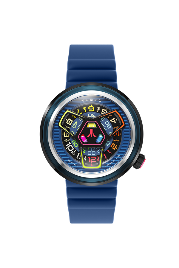 A timepiece inspired by the unmistakable color palette of the legendary ATARI Console, this collaborated release between Nubeo and Atari transforms time-telling into an experience its rotating disc display offers a dynamic, playful reimagination of classic timekeeping. Every passing second is a nod to nostalgia, movement, and the enduring spirit of innovation.